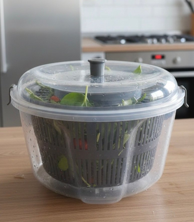 Gri plastik salata kurutucu, saydam kapak ve kolay dönüş için sap içerir. Mutfakta kullanışlıdır.
