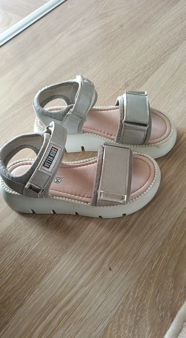 Bej ve gri tonlarında, tokalı kayışları olan platform topuklu sandaletler. Minimalist ve trend sokak stili için uygundur. ortopedik az kullanıldı sorunsuz