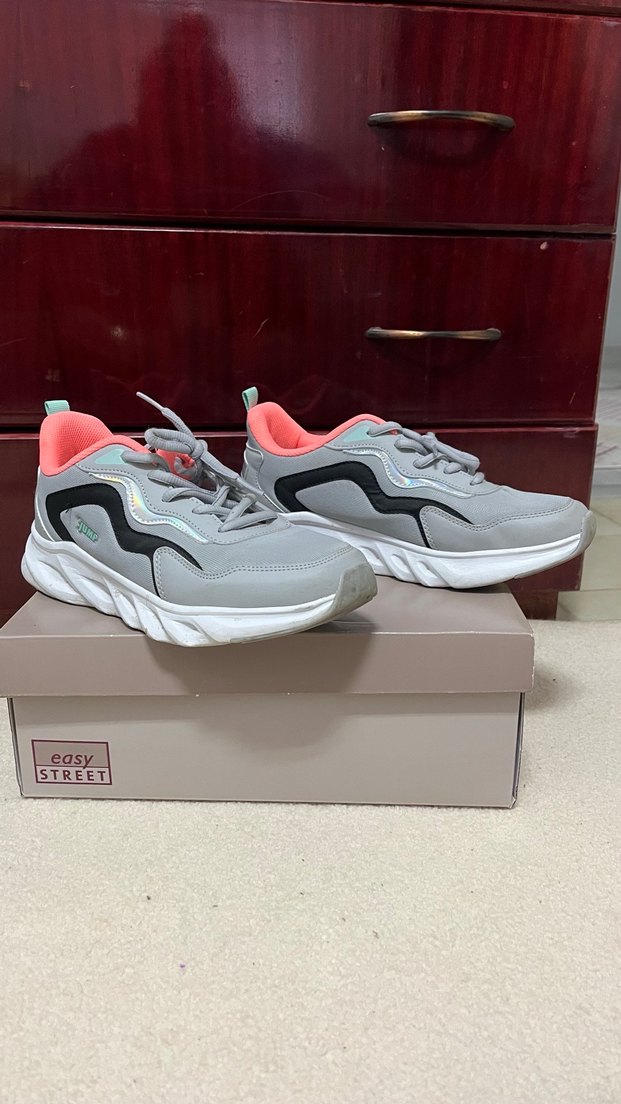 Gri renkte, platform topuklu ve bağcıklı kadın spor ayakkabısı. Kauçuk malzemeden yapılmış, baskılı detaylara sahip ve sokak stiline uygun rahat bir tasarım.