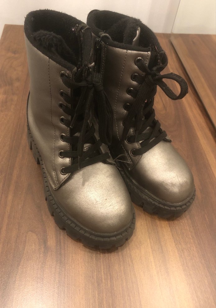 Gri platform topuklu, metal detaylı, bağcıklı kadın botları. Goth punk tarzını yansıtan, günlük kullanıma uygun, rock punk havasında.