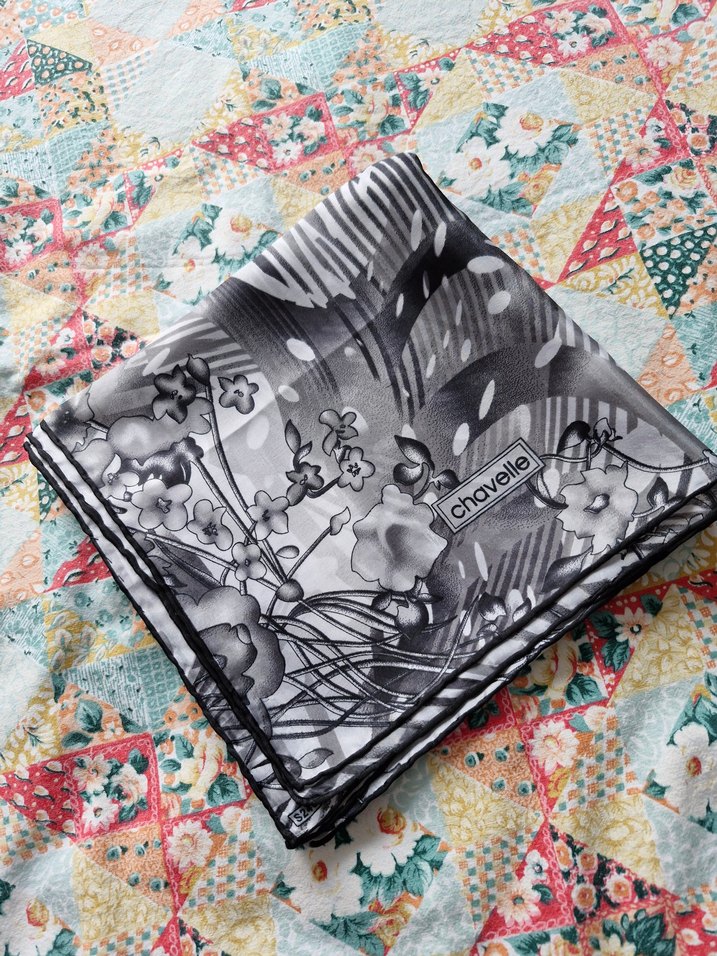 Gri renkli, pliseli sentetik kumaştan kadın fular. Çiçek ve soyut desenlerle avant-garde ve modaya uygun tarzı yansıtıyor.