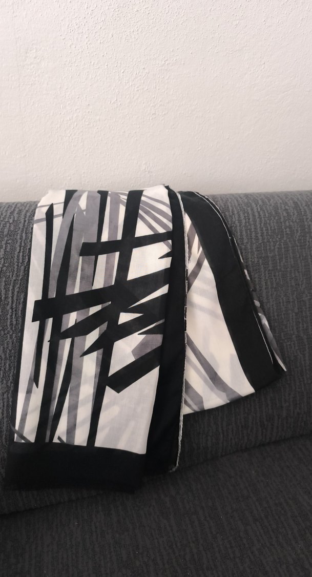 Gri renkli, pliseli kadın fular, çağdaş ve avangard siyah geometrik desenlere sahip yumuşak sentetik kumaftan yapılmıştır.