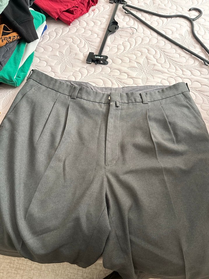 Gri renk, keten kumaştan yapılmış, bol kesim ve pliseli erkek pantolon. Normal boyda, klasik ve ofis tarzına uygun.