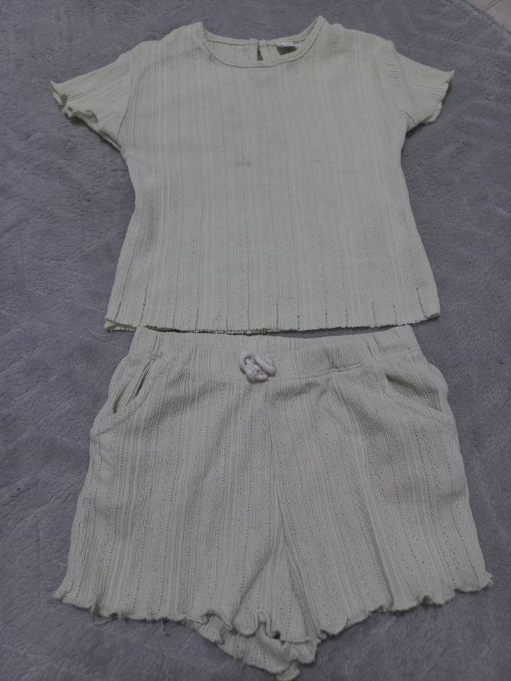 Kısa kollu ve pliseli kumaştan oluşan, desensiz gri kız bebek üst ve şort takımı. on kısımda leke var etek ile ikisinin fiyati
