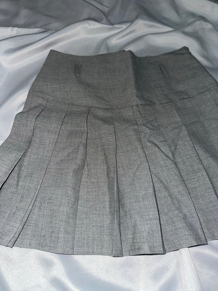 Gri renk, sentetik kumaştan yapılmış, normal uzunlukta pliseli midi etek. Ofis ve sokak stiline uygun, rahat kesim.