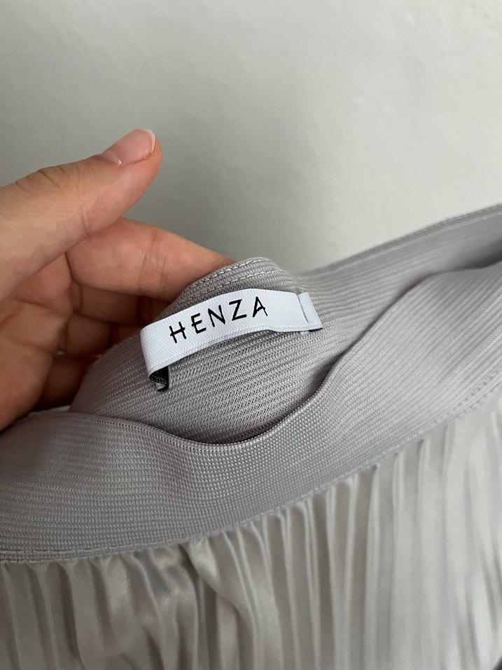 Gri sentetik kumaştan, pliseli ve normal midi boyda, fit kesim etek. Günlük sokak stili için baskılı desene sahip. Marka: HENZA.