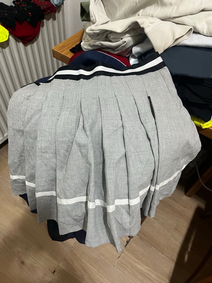 Gri renkli, keten kumaştan yapılmış pliseli midi etek. Rahat kesimi ve beyaz çizgili detayıyla günlük rahat sokak stiline uygundur.