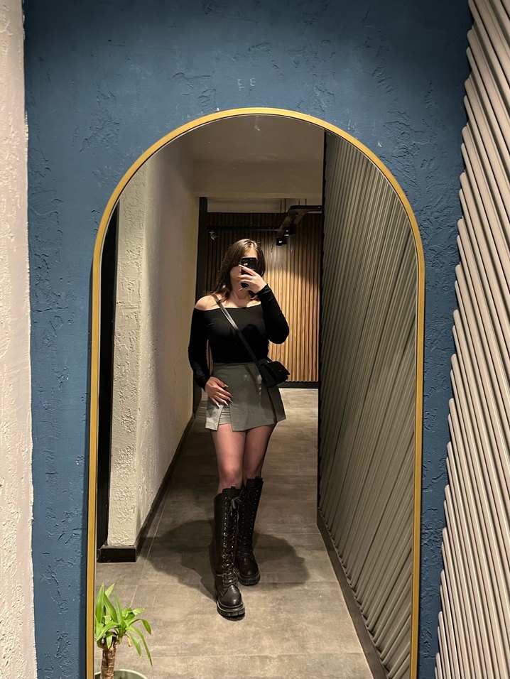 Gri renkte, sentetik kumaştan yapılmış, vücuda oturan ve pliseli kısa mini etek. Günlük sokak stili için uygundur, desensiz ve sade tasarıma sahiptir.