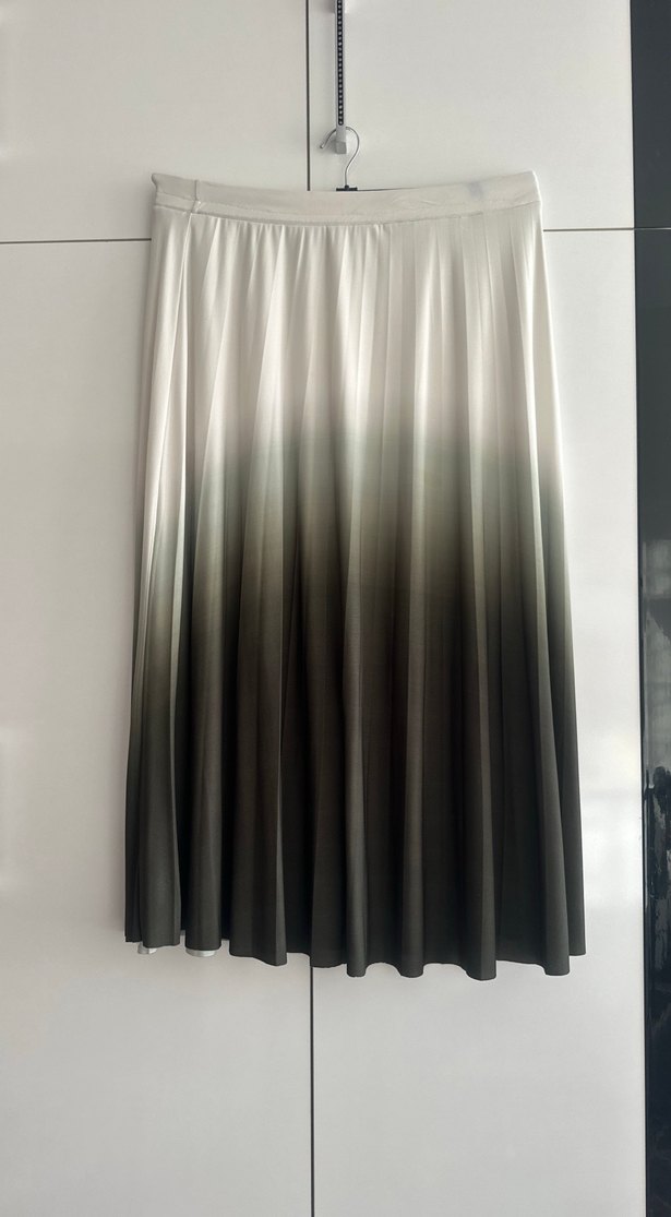 İpek gibi dokuda, pliseli ve gri tie-dye desenli uzun etek. Bol kesim, ofis için uygun, minimalist ve çağdaş tarzda. ️