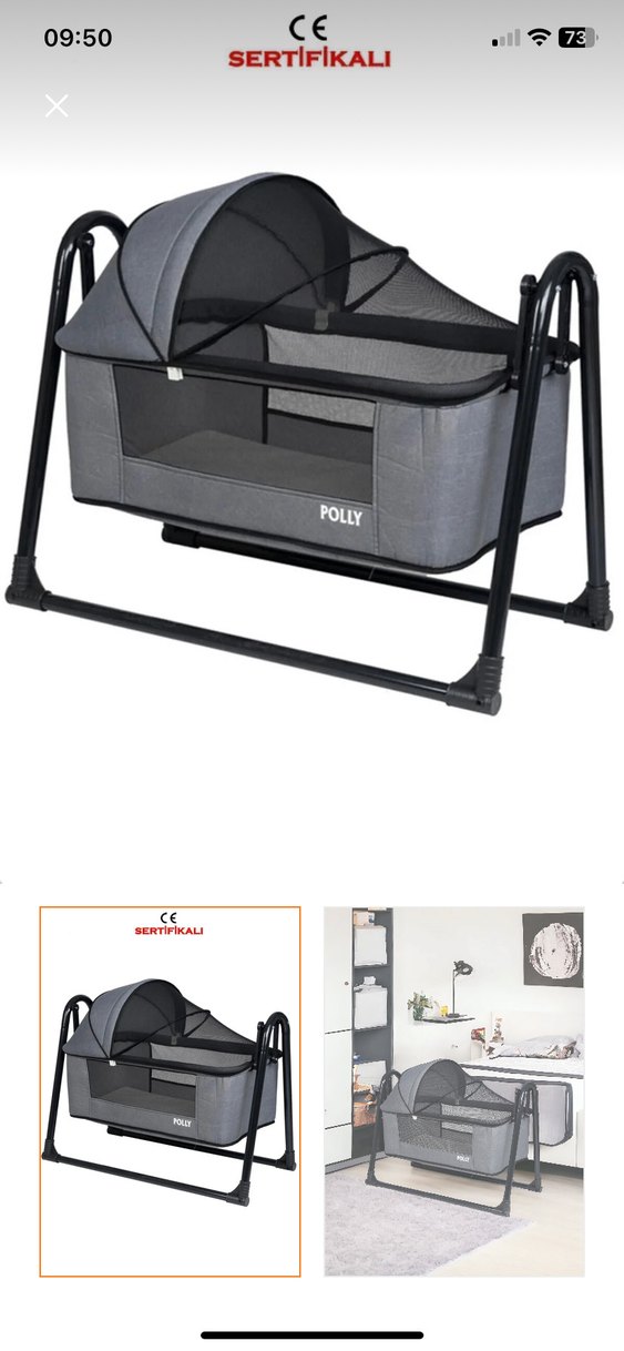 Gri POLLY marka sallanır bebek beşiği, sağlam iskelet ve tente ile güvenli uyku sağlar. Nefes alabilen file yanlar ve dengeli sallanma özelliği bulunur. Sadece İçi defolu onun dışında bir sorunu yok temiz kullanıldı uygun fiyat