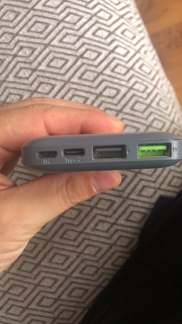 USB ve Type-C girişli gri power bank, birden fazla cihazı şarj edebilir. Kompakt ve taşınabilir tasarım.yan düğmesi basmaktan oturu ıcerı batık cok az kullanılmıs harıka cıhaz