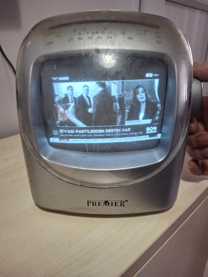 Gri renkli Premier mini CRT monitör, kavisli ekran ve dahili kanal seçiciye sahiptir. Televizyon ve radyo çalışıyor ,sadece anteni kopmuştur