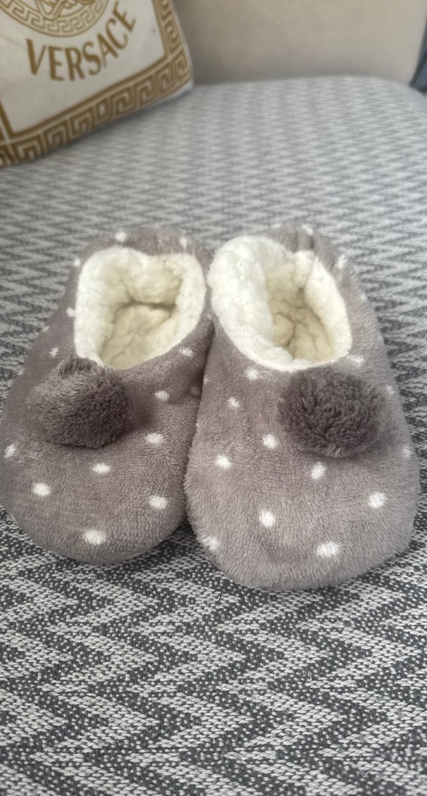 Gri puanlı desenli, tüylü detaylı, yumuşak kumaşlı, dolgu topuklu kadın ev patiği . Rahat iç yüzeyi günlük kullanım için uygundur.