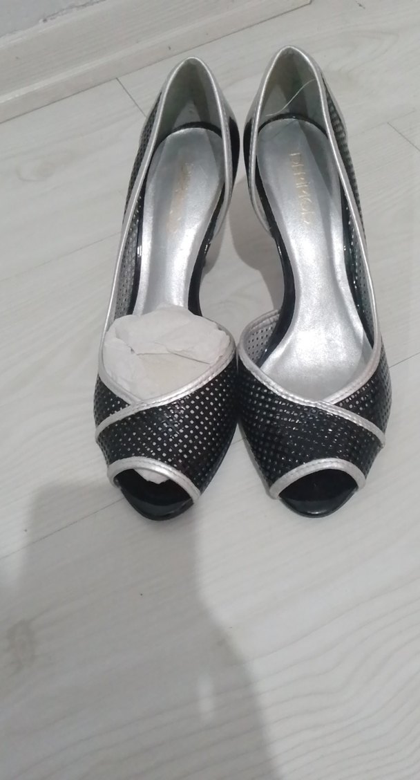 Gri puanlı siyah stiletto topuklu kadın ayakkabı, tokalı ve kauçuk malzemeden yapılmıştır. Düğün ve özel etkinlikler için uygundur.