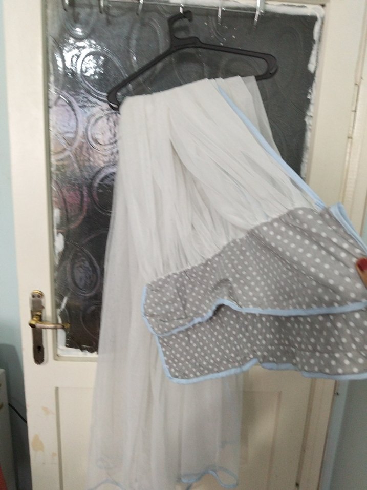 Beyaz kumaş üzerine gri puantiyeli ve açık mavi kenarlıklı bölümle bebek cibinliği. 160 cm