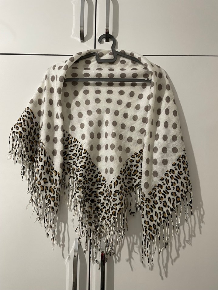 Gri renkte, puantiyeli ve leopar desenli püsküllü, yumuşak tekstil kumaştan bohem tarzda kadın şalı.