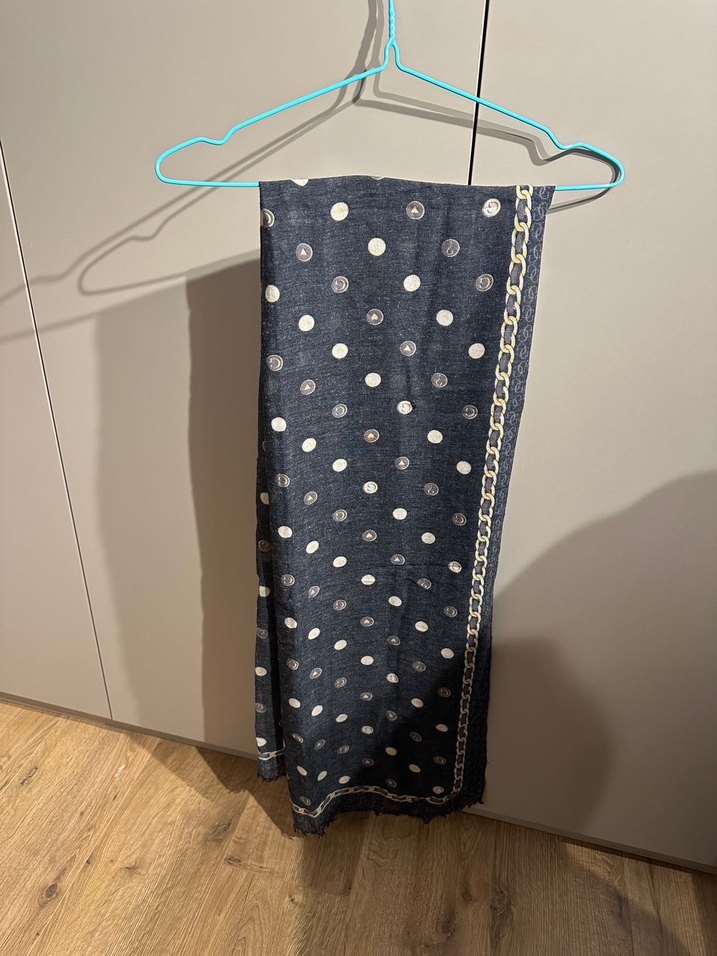 Gri renkte, beyaz puantiyeler ve kenarında zincir desenli, drapeli denim kumaştan bohem ve minimalist tarzda kadın şalı.