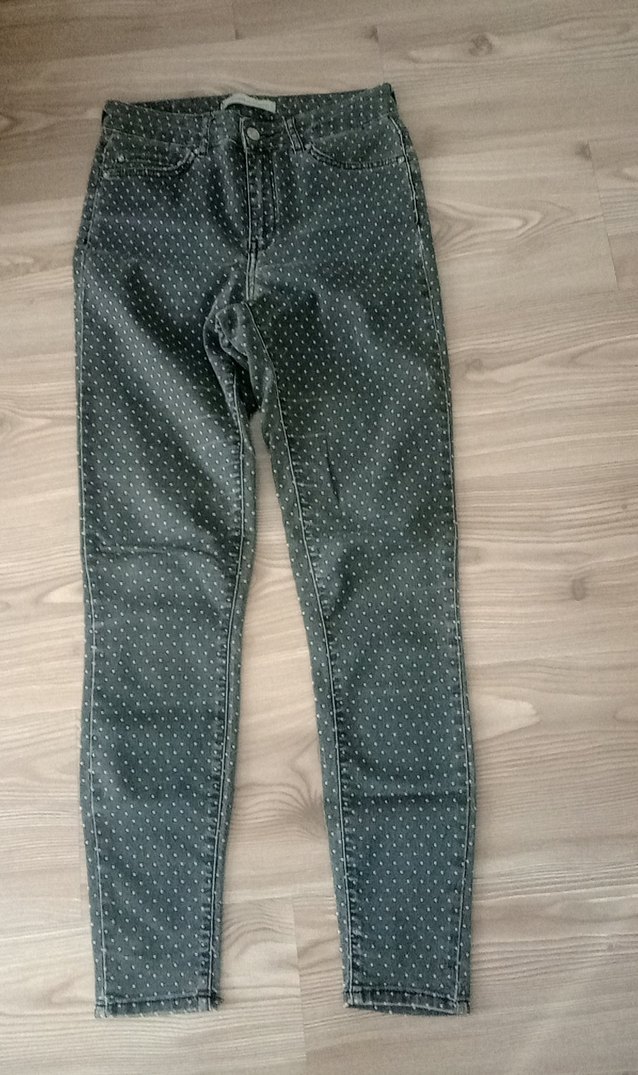 Gri renkli, puantiyeli desenli, düğmeli ve normal boyda kadın kot pantolon, günlük rahat kullanım için uygundur.