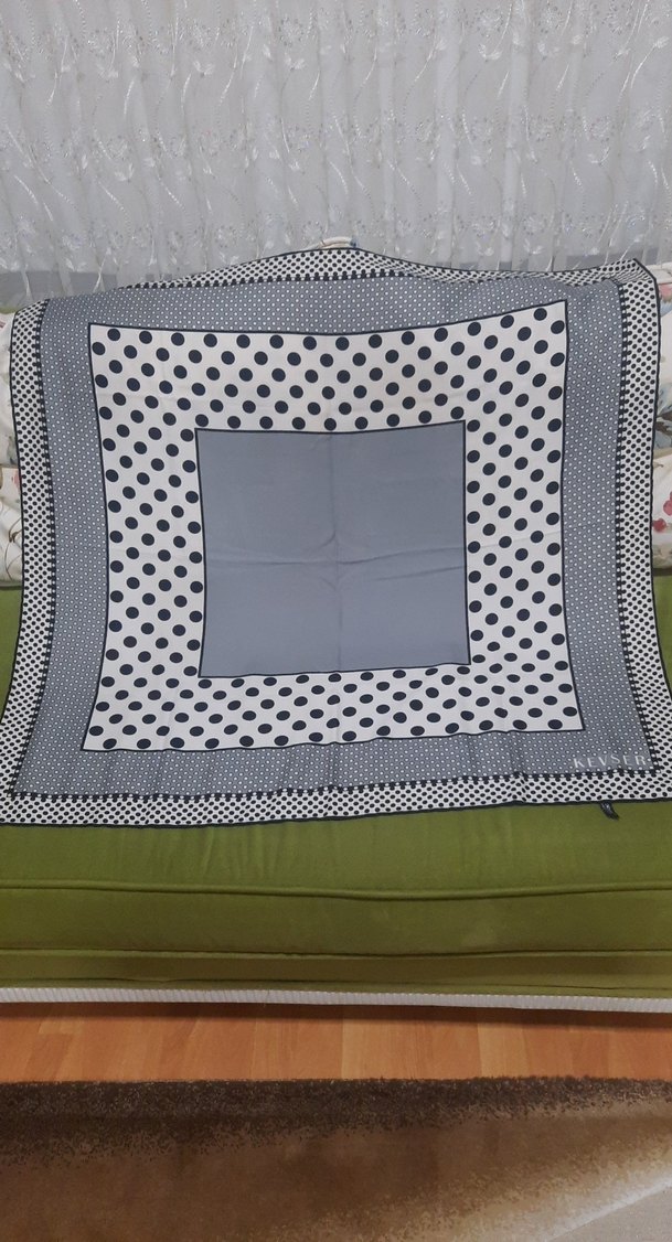 Gri zemin üzerine siyah puantiyeler ve fırfır detayları bulunan kadın fuları, yumuşak sentetik kumaştan yapılmıştır. Bohem ve Paris tarzlarını çağdaş bir dokunuşla birleştirir.
