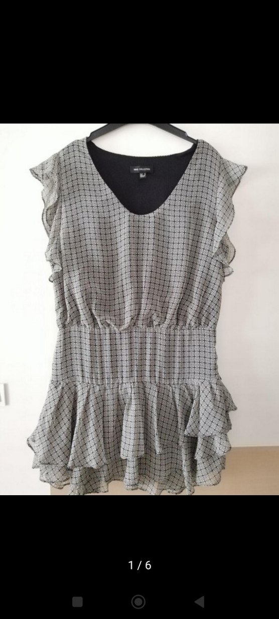Gri puantiyeli, V yakalı ve fırfırlı detaylara sahip, rahat kesim mini elbise, yumuşak sentetik kumaştan üretilmiştir, günlük kullanım için uygundur.