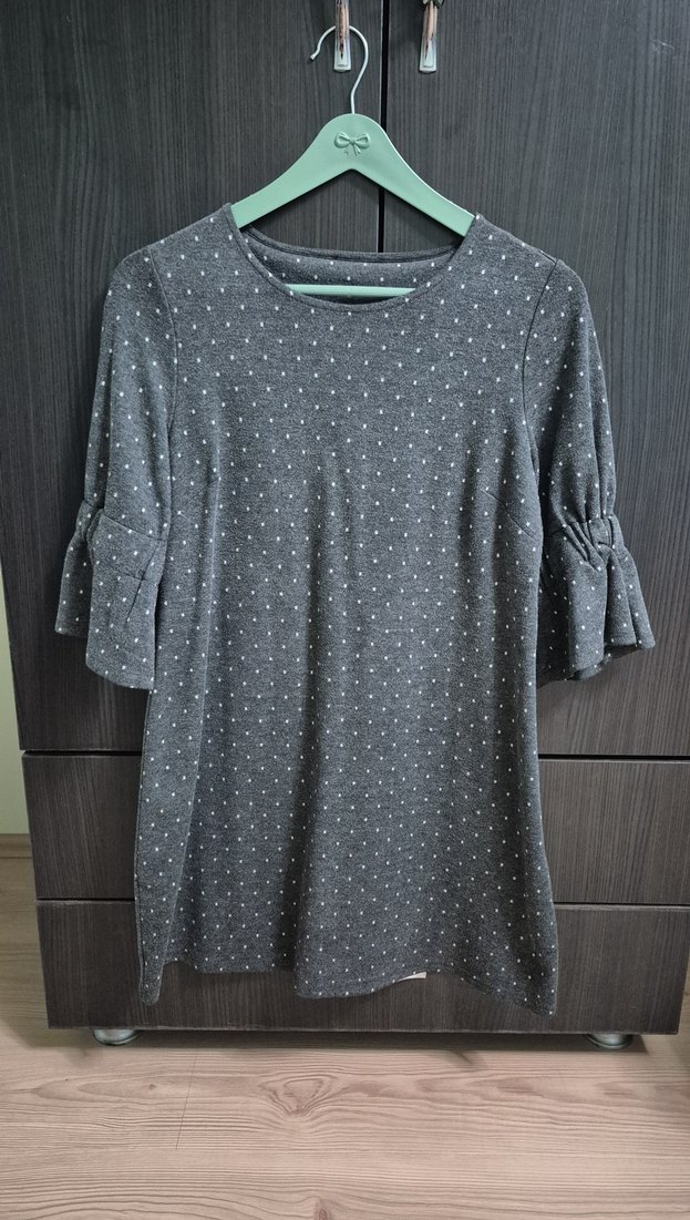 Gri renkli hamile bluzu, yuvarlak yaka ve düğmeli kısa kollara sahiptir. Bol kesim ve midi boydadır, ince puantiyeli deseni bulunur. Günlük rahat kullanıma uygundur.
