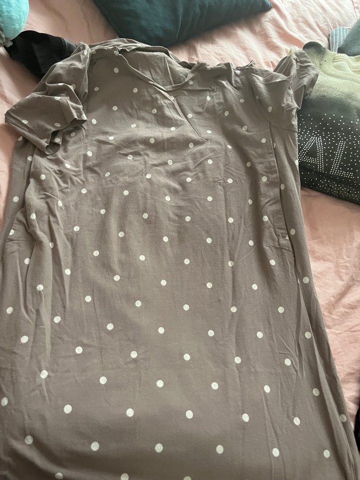 Gri renkte, beyaz puantiyeli, kısa kollu ve V yakalı uzun hamile ve emzirme geceliği, rahat ve bol kesimdir.