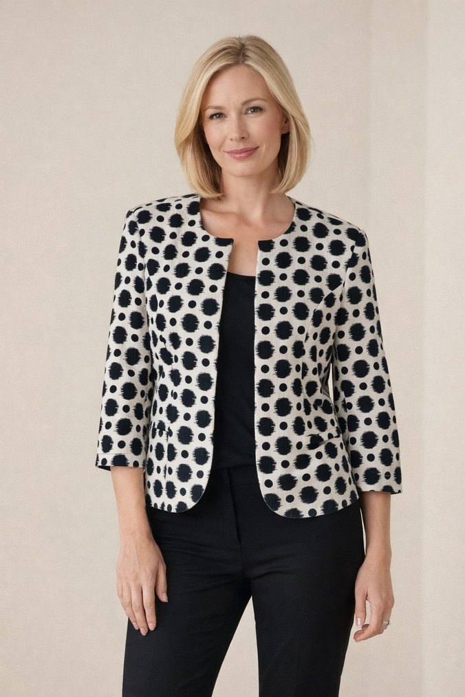 Kadınlar için gri puantiyeli, düğmeli, uzun kollu, midi boy, normal kesim, sentetik kumaştan yapılmış modern tarzda blazer ceket. Ofis kullanımı için uygundur.