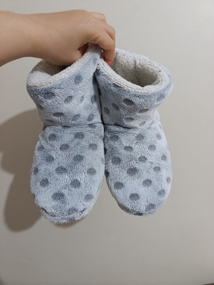 Gri puantiyeli ve düğmeli detaylı, yumuşak dokulu kız çocuk sıcak terlikleri, ev içinde rahatlık sağlar.