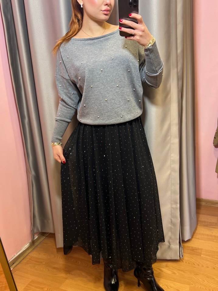 Gri Puantiyeli Örme Midi Etek S-M-L