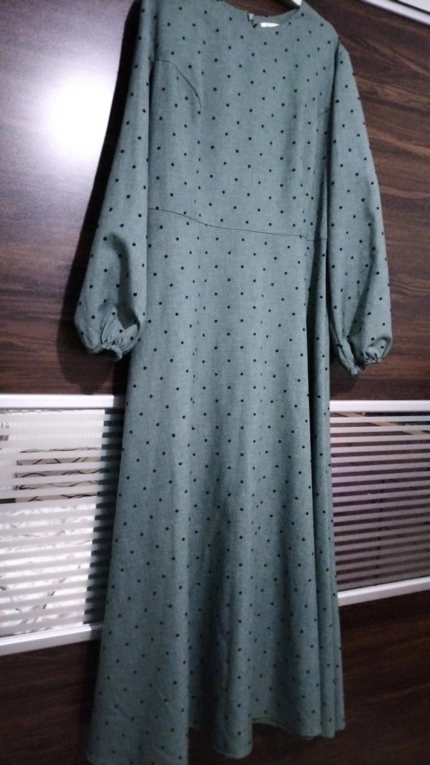 Gri renk, siyah puantiyeli, V yaka ve uzun kollu, bol kesim bohem tarzda uzun elbise. Drapeli detay ve vintage modest görünüm sunar.
