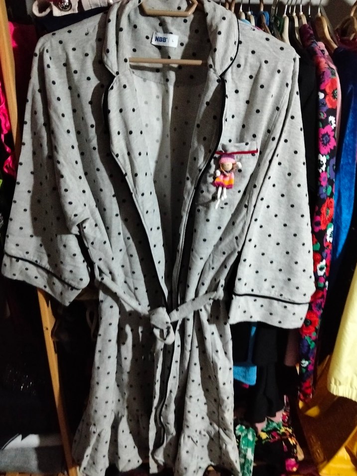 Gri renkte, puantiyeli desenli, uzun ve bol kesim kadın sabahlık. Askılı kollu ve kuşaklı, rahat bir tarz sunar. ️
