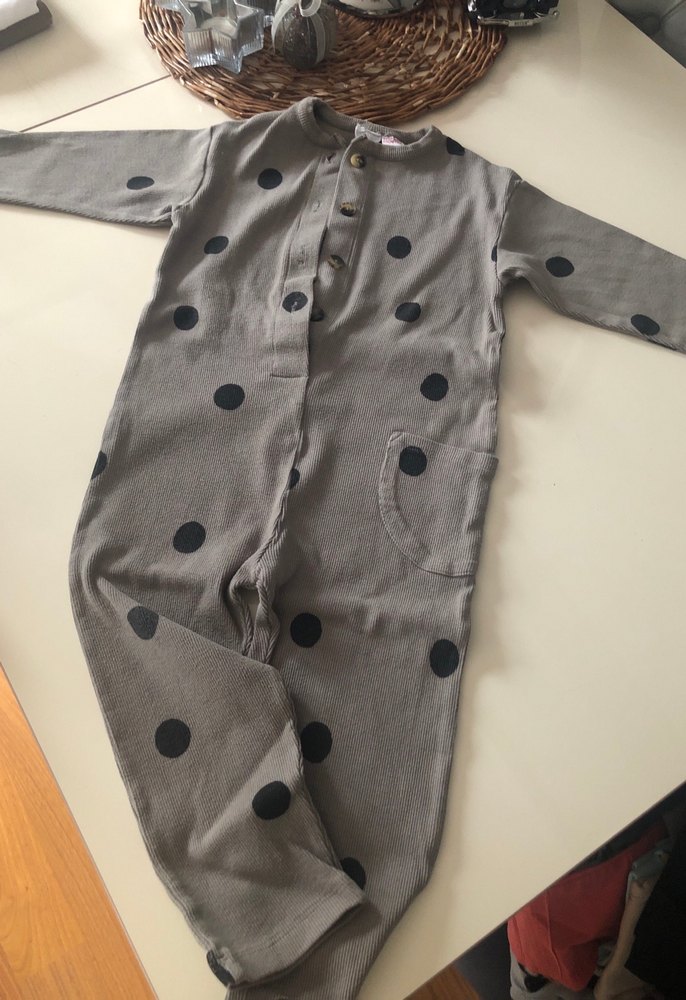 Gri renkte, uzun kollu ve yuvarlak yakalı bebek tulumu. Düğmeli ve puantiyeli desenli, yumuşak keten kumaştan üretilmiştir. Küçük cep detayına sahiptir.