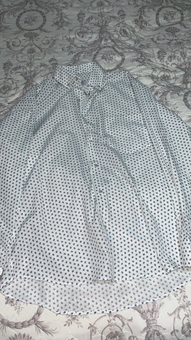 Gri puantiyeli, düğmeli, uzun kollu, yakalı ve bol kesim erkek gömleği. Rahat sentetik kumaştan, günlük sokak stiline uygun.
