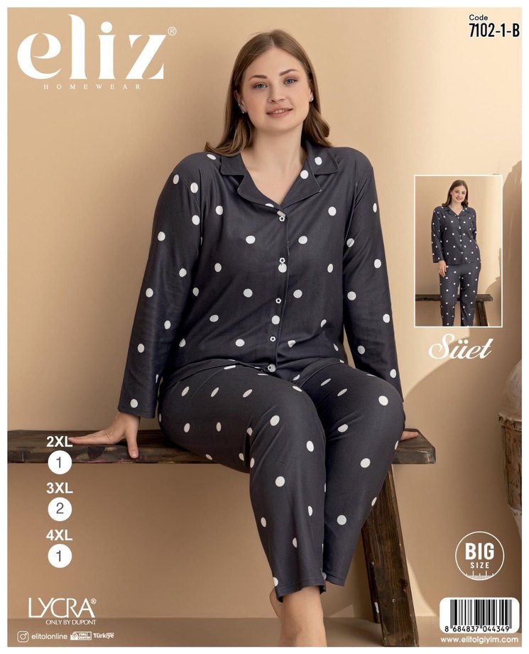 Gri zemin üzerine beyaz puantiyeli, uzun kollu ve bol kesim kadın pijama takımıdır. Üstü düğmeli, altı rahat pantolondan oluşur. ✨