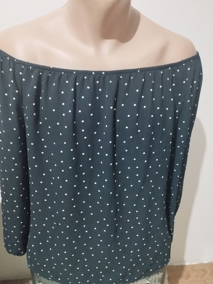 Gri renkte, puantiyeli uzun kollu ve kayık yaka bluz. Rahat kesimi ve düğmeli detayıyla günlük sokak tarzına uygundur.