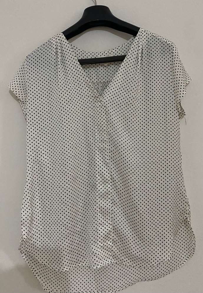 Gri puantiyeli, V yaka, düğmeli, kısa kollu, bol kesim beyaz bluz. Günlük sokak tarzına uygun rahat bir modeldir.
