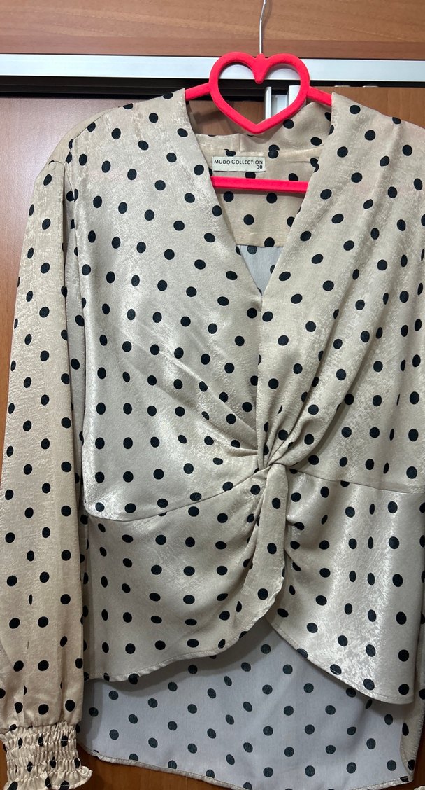 Gri puantiyeli, V yakalı, uzun kollu, düğmeli ve bol kesim kadın bluz. İpek gibi kumaştan, ofis kullanımı için uygun.