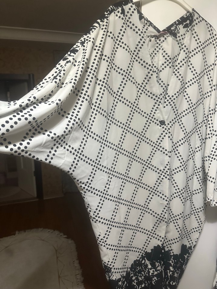 Gri puantiyeli beyaz kimono bluzu, uzun kollu ve V yakalıdır. Düğmeli ve bol kesim olup günlük kullanıma uygundur. Butik tasarımıdır iade yoktur