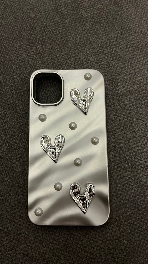 İPhone 11 kaplar Gotik tarzda, gri renkli ve pul detaylı, kalp desenli telefon kılıfı. İnci görünümlü süslemeler içerir