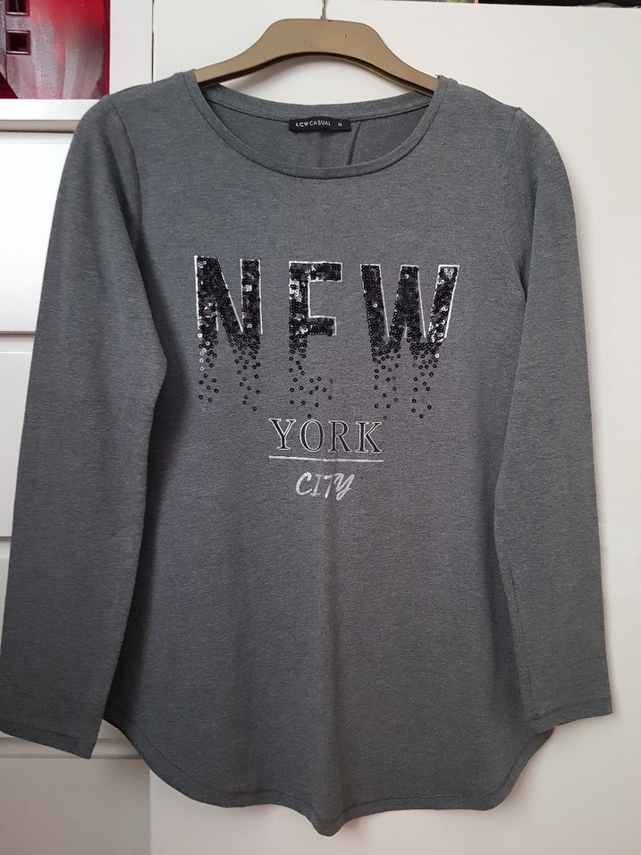 Gri uzun kollu, yuvarlak yaka ve bol kesim sweatshirt. Sentetik kumaş üzerine siyah pul işlemeli "NEW YORK CITY" baskılı, günlük kullanıma uygun. #gribaskılısweatshirt