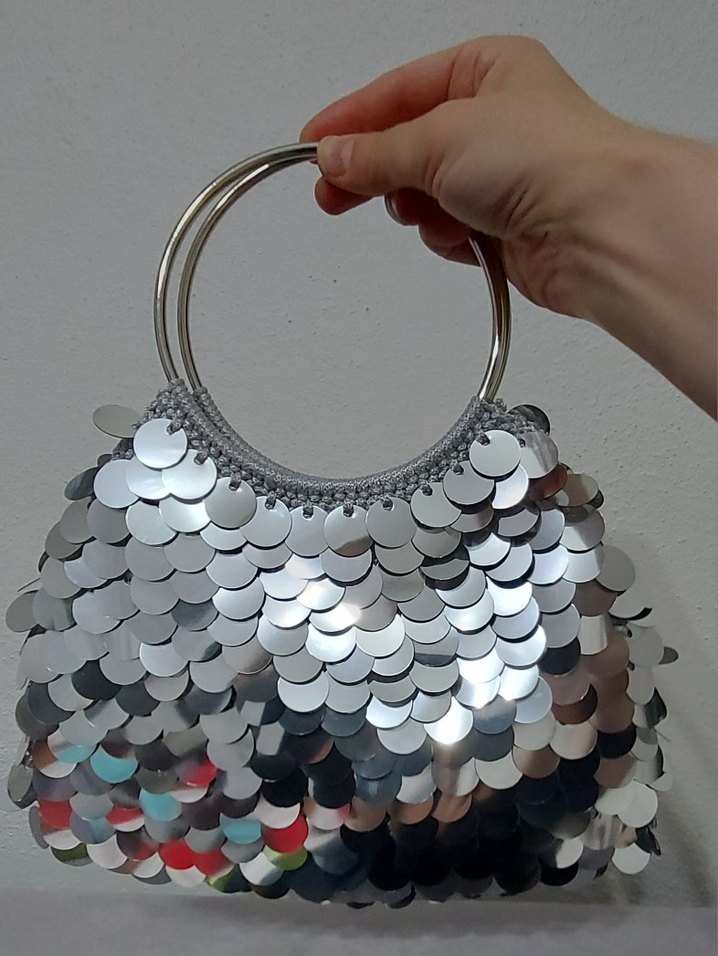 Metal saplı, pul detaylı bu kadın çantası, dese Parlak ve retro tarzıyla parti ve günlü kullanim için uygun. ✨kendi el emeğimdir
