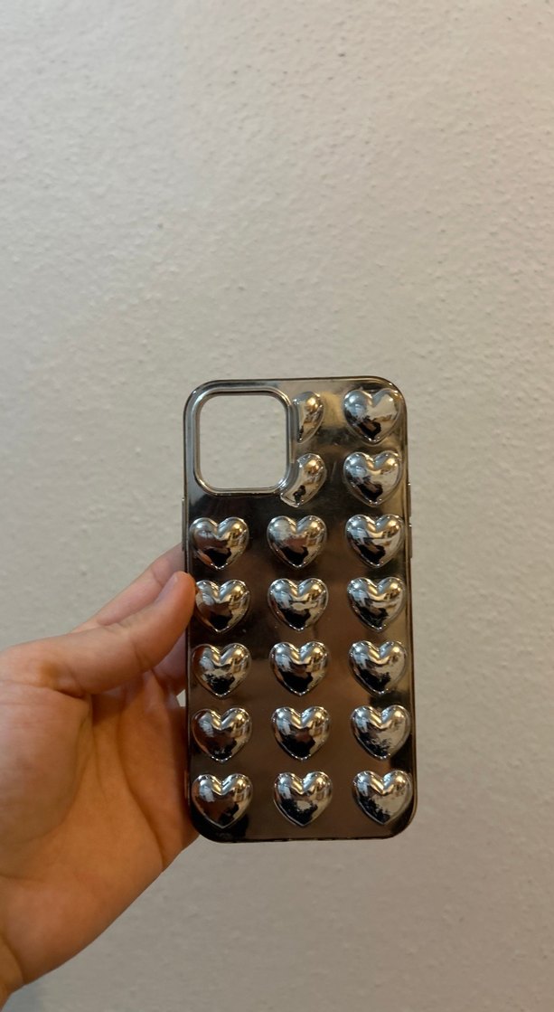 Gri renkte, pul detaylı ve kalp şekilli kabartmalı street wear tarzı telefon kılıfı. Biraz soyulmuş