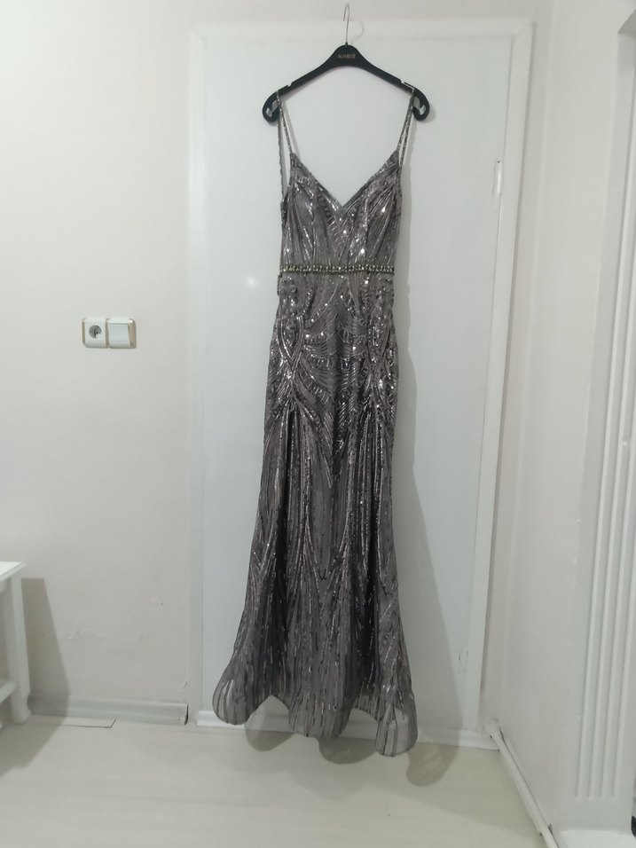 İnce askılı, V yaka ve pul detaylı gri uzun abiye elbise, yılan deseniyle şık ve modern bir görünüm sunar. Düğünler için uygundur. ✨
