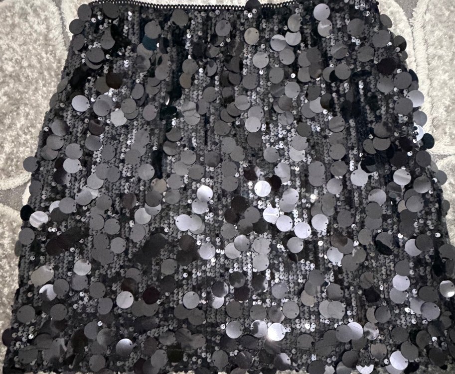 Gri pul işlemeli puantiyeli desenli, sentetik kumaştan yapılmış, vücuda oturan midi mini etek. Glamour ve gotik parti tarzı için uygun. ✨