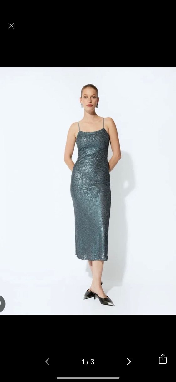 Gri yılan desenli, uzun askılı ve drapeli, vücuda oturan elbise. Modern ve şık, romantik akşamlar için uygun.