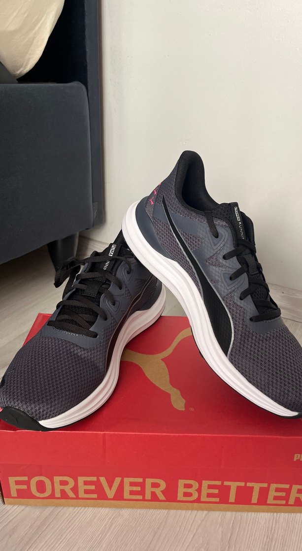 Gri Puma erkek spor ayakkabısı, elastik bağcık ve baskılı detaylara sahip. Sokak stili ve spor için uygun, kauçuk tabanlı ve rahat.