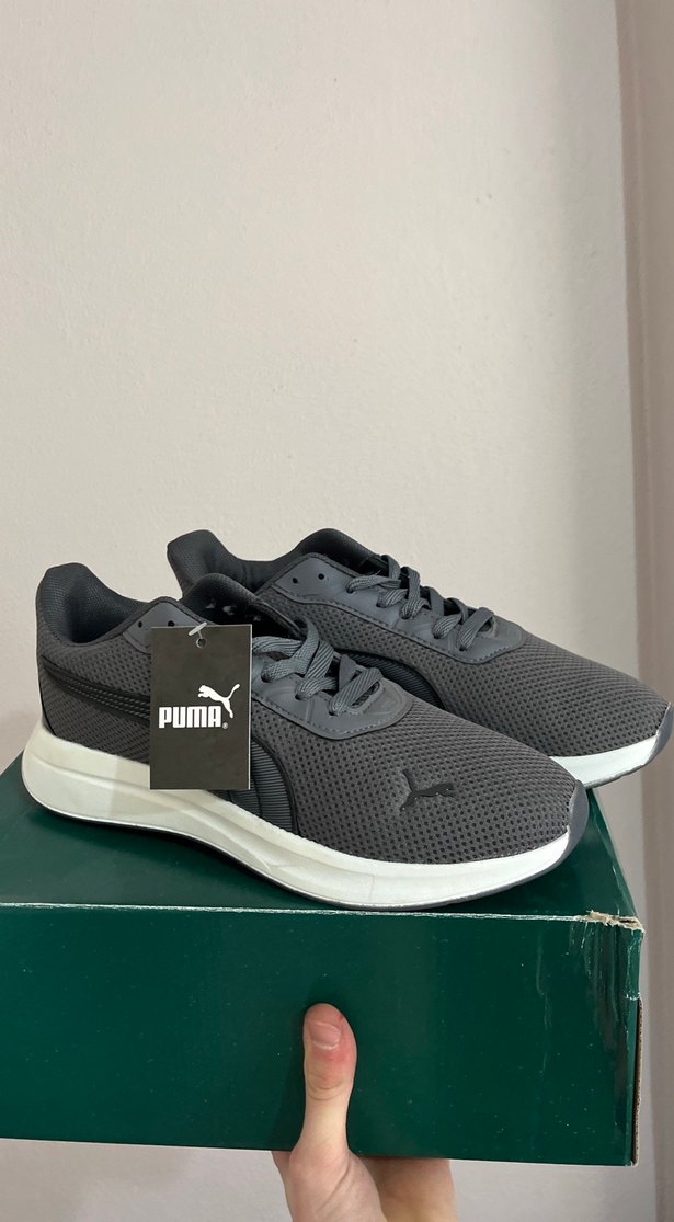 Gri Puma erkek spor ayakkabısı, baskılı detaylı, kauçuk tabanlı ve cırt cırtlı özellikli. Athleisure ve sokak stili için uygundur.