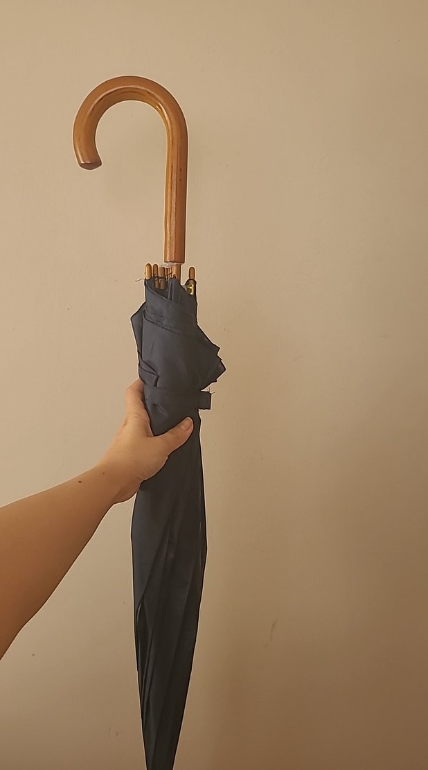 Ahşap saplı, gri renkli ve püsküllü kadın şemsiye, eski moda Paris gotik tarzını yansıtıyor. ☂️