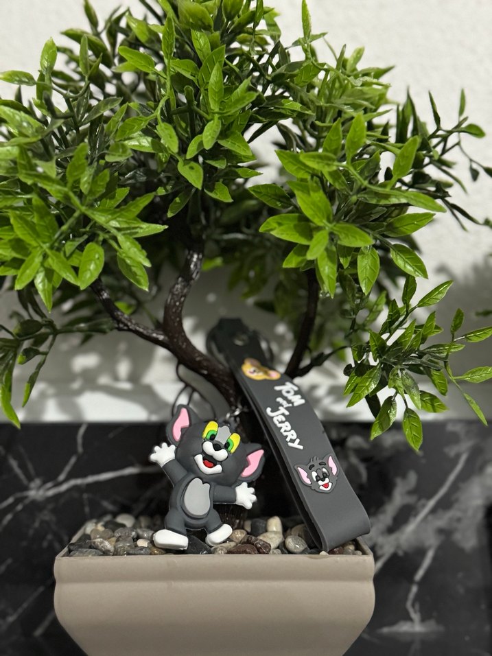 Gri renkli, oyuncu karikatür figürlü ve püsküllü kadın anahtarlık, minimalist ve rock punk tarzını yansıtıyor.