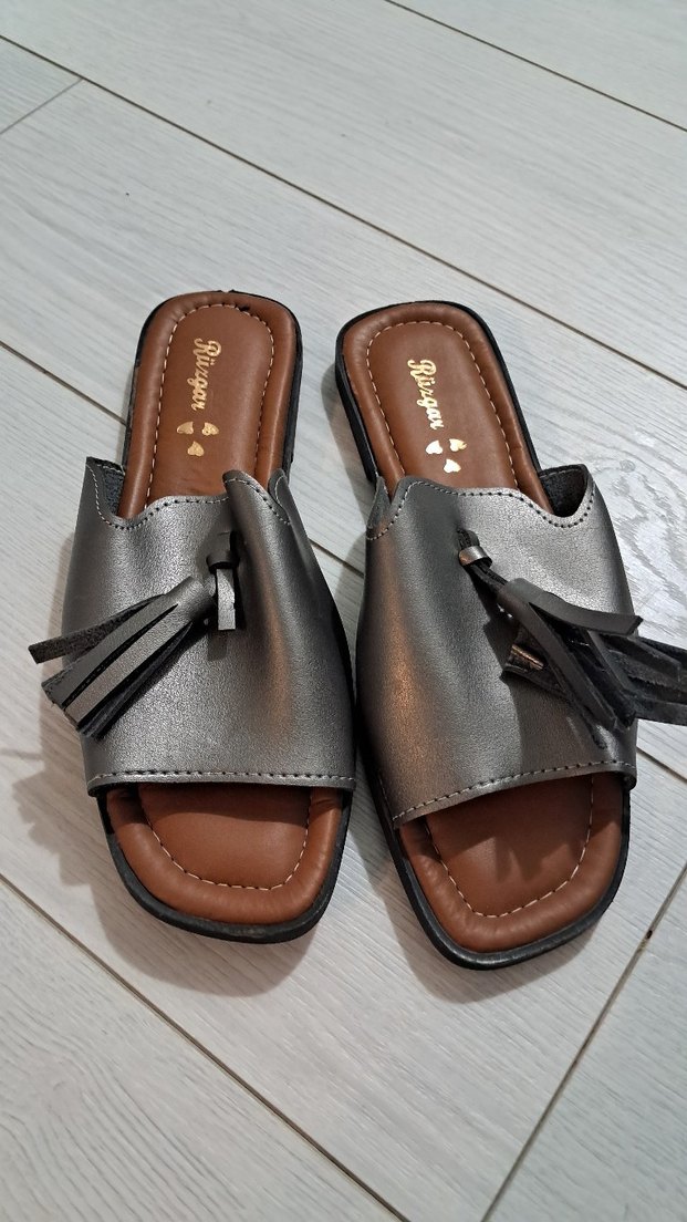 Gri renkte, nakış detaylı ve püskül süslemeli kadın dolgu topuk terlik. Dayanıklı kauçuk malzemeden, günlük rahat kullanım için uygundur. Marka: Riurgar.